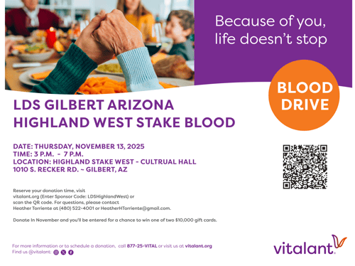 Join us and help save lives by donating blood. 3pm - 7pm on Thursday, November 13th. Reserve your donation time by visiting this link: Donate Now