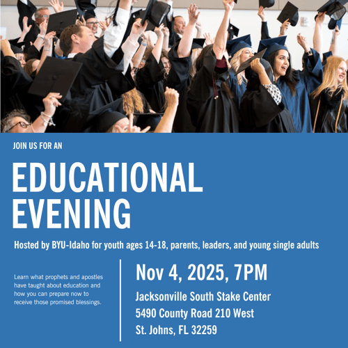 Hosted by BYU-Idaho for youth ages 14-18, parents, leaders and young single adults. This is held at Jacksonville South Stake Center: 5490 County Rd 210 West St. Johns, FL 32259