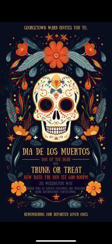 Thank you to all who signed up to contribute to our delicious dinner! Trunk or Treat car participants, please arrive 10 mins early to park on the North side of the building (by the Bishops Office). Bring 1-2 pictures of an ancestor/family member!