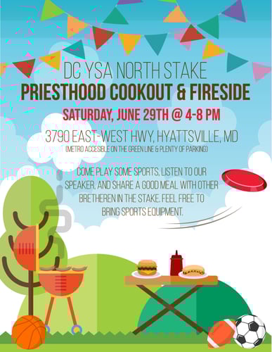 The DC YSA North Stake is hosting a Priesthood Cookout & Fireside on Saturday, June 29th from 4-8 pm. Come play sports, listen to a speaker, and share a good meal with other brethren in the stake. Feel free to bring sports equipment.