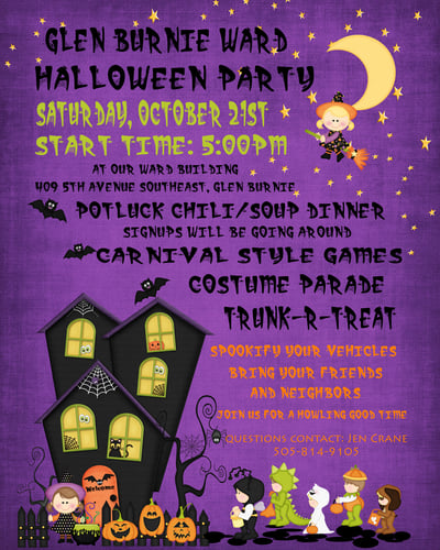 Glen Burnie ward of The Church of Jesus Christ of Latter-Day Saints will host a family friendly Halloween party and Trunk r Treat.