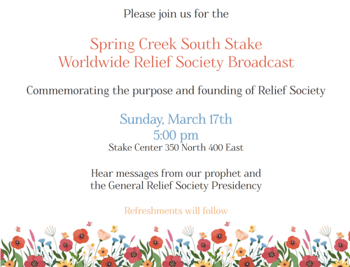 All women 12+ are invited to join us for a celebration commemorating the founding of the Relief Society. We will view the worldwide broadcast with messages from the Prophet and the Relief Society General Presidency followed by refreshments.