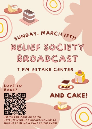 Join us at the Stake Center to view the Worldwide Relief Society broadcast, cake to follow! See QR code on flier if you would like to sign up to bring a cake.