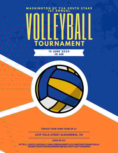 The Washington DC YSA South Stake 1st Annual Volleyball Tournament is on June 15 starting at 10am at the Mount Vernon Stake Center, 6219 Villa St, Alexandria, VA 22310. You must sign up before June 8, 2024. You can only be on one team with six to eight people, no double dipping. The tournament is single elimination.