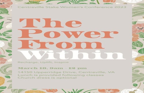 Join us for the 2023 Centreville Stake Women's Conference. Lunch will be provided after the classes. Church dress is optional.